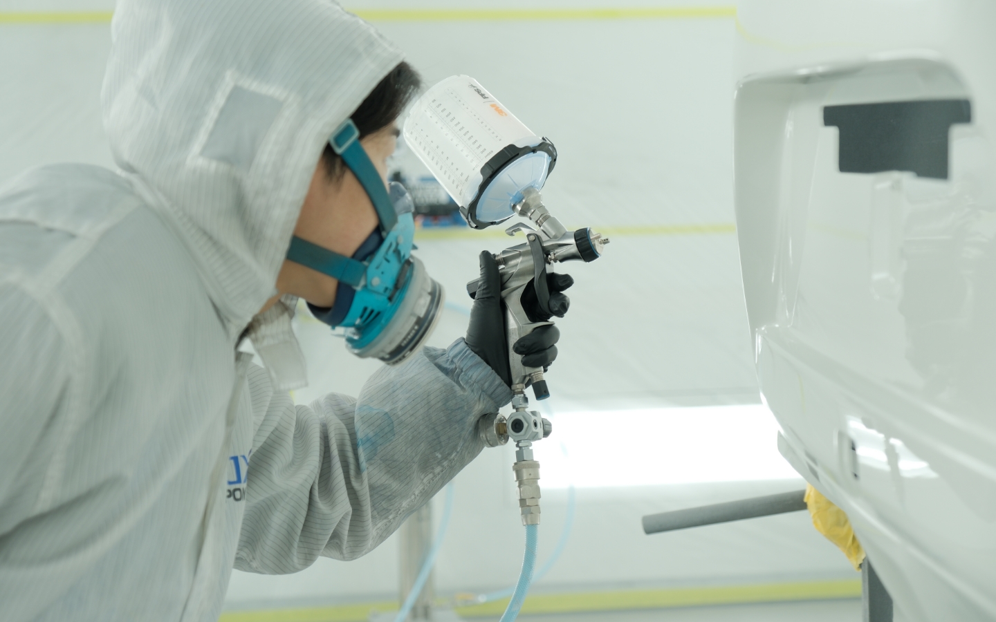 鈑金工程終了後、塗装の為に下地塗装(サフェーサー)をし、調色作業にてお車に合わせた色を配合し、最新型塗装ブースで現車に似せた塗装を施します。